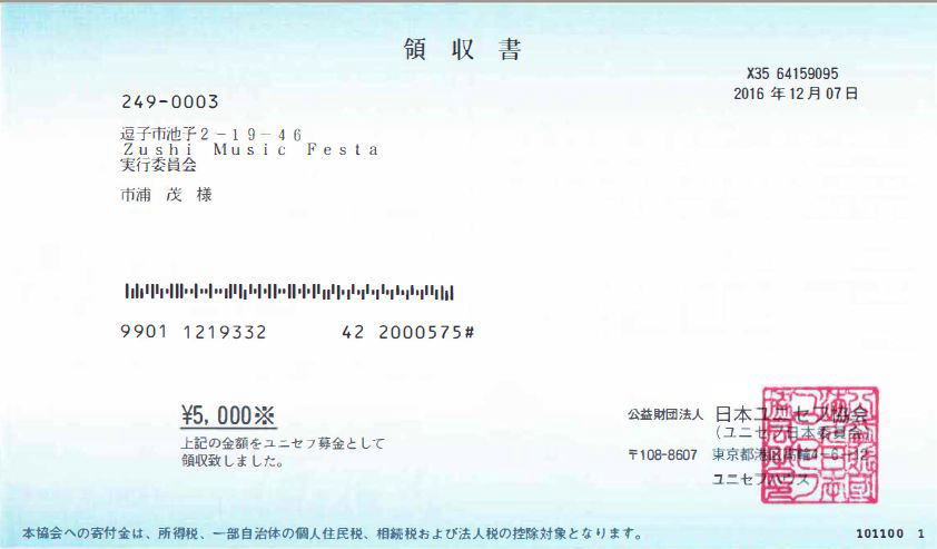 2016年11月27日(日)のZushi Music Festa with Dance(冬編)ライブにて、ご来場の方々からの善意、とチケット収益金のから 募金として、5000円を公益社団法人 日本ユニセフ協会へ募金いたしました。 ご協力ありがとうございました。