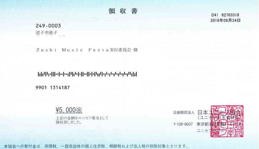 2016年11月27日(日)のZushi Music Festa with Dance(冬編)ライブにて、ご来場の方々からの善意、とチケット収益金のから 募金として、5000円を公益社団法人 日本ユニセフ協会へ募金いたしました。 ご協力ありがとうございました。