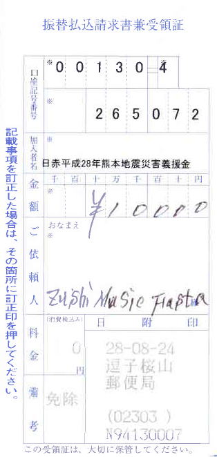 2016年08月20日(土)のZushi Music Festa 2016 with Dance(夏編)ライブにて、ご来場の方々からの善意、5,000円を公益財団法人 日本ユニセフ協会へ募金、10,000円を日本赤十字社熊本地震災害義援金へ募金、10,000円をずし平和デー実行委員会に寄付いたしました。